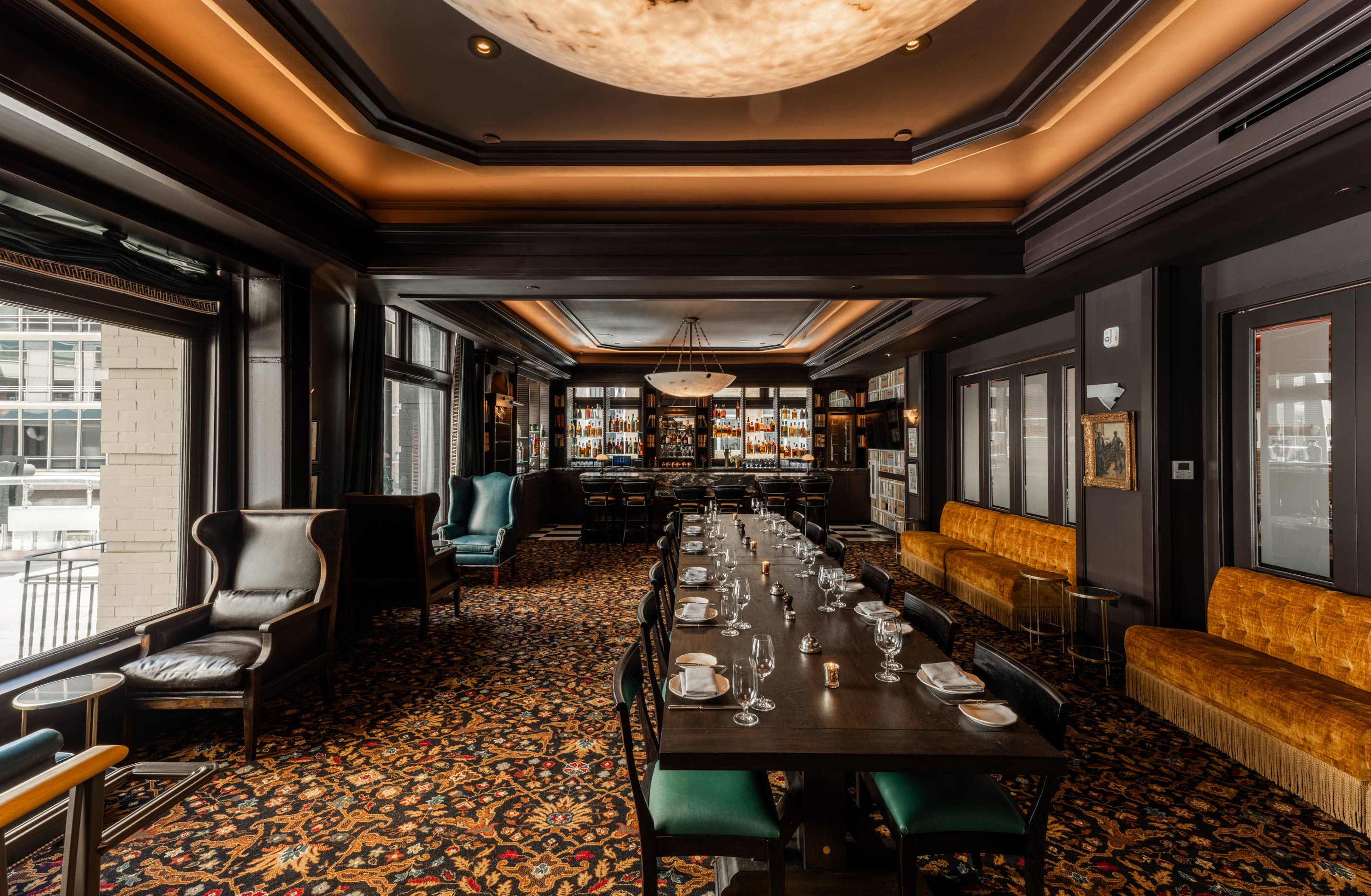 A semi-private space with a large bar, perfect for receptions or intimate seated gatherings.